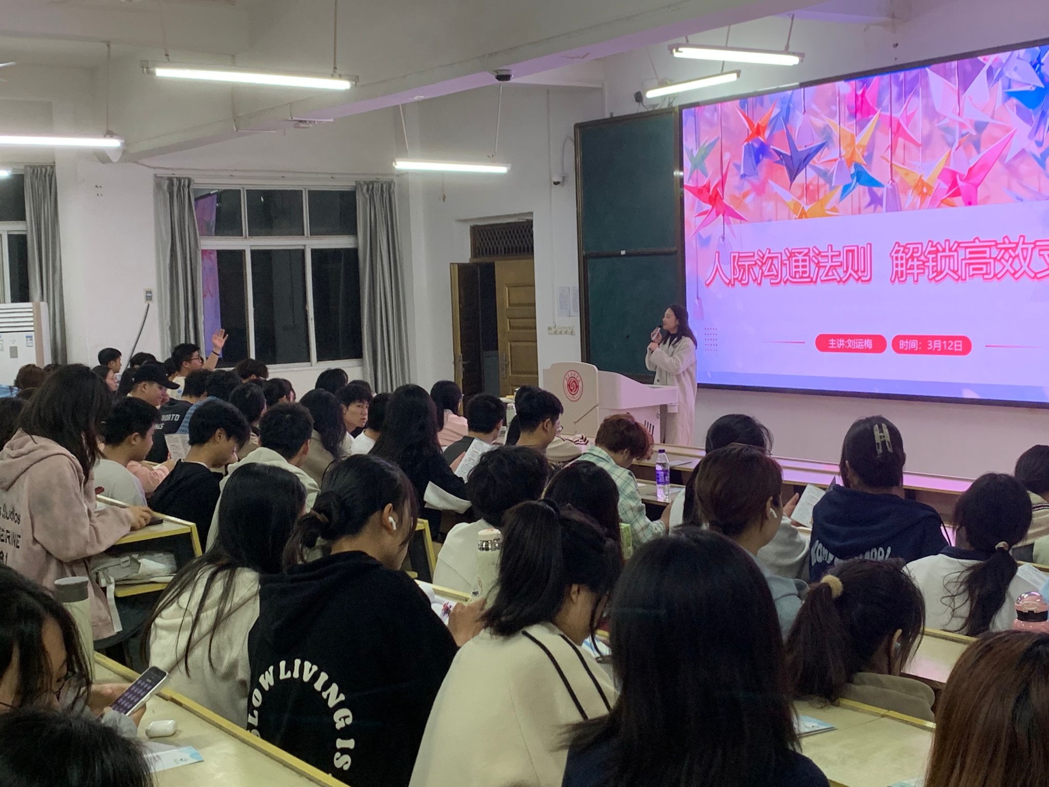 本网讯:3月12日晚上,熊猫体育在主教Z1D1开展以 “人际沟通法则,解锁高校支持” 为主题的心理健康讲座,本次讲座由心理健康教育与咨询中心刘运梅老师主讲。熊猫体育各班心理委员、心理联络员等200余名员工参加讲座。
