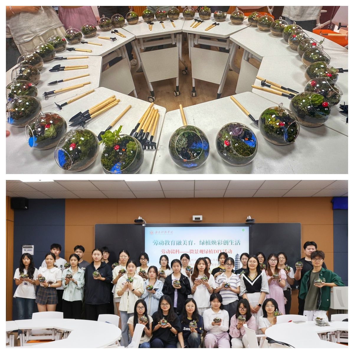 制作过程中,员工们分成小组,积极动手实践。同学们化身“自然设计师”,将绿意盎然的苔藓、形态各异的多肉与精巧的装饰品巧妙搭配,精心打造出属于自己的微观世界。一方方玻璃容器中,绿意蔓延、春色跃动,既有自然的清新,又融入了独特的艺术气息。大家相互交流创作思路,分享栽培心得,现场气氛轻松愉悦。会计231班方可嘉同学表示:“通过此次活动,我真正感受到了微景观以方寸之地浓缩出的自然意趣。我不仅需要细致地模拟出植物生长的环境,还需要构思独具特色的布局与搭配,让我解锁新技能的同时,身心也得到了充分放松!”