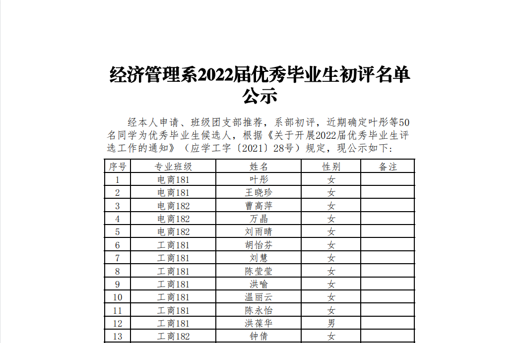 经济管理系2022届优秀毕业生初评结果公示