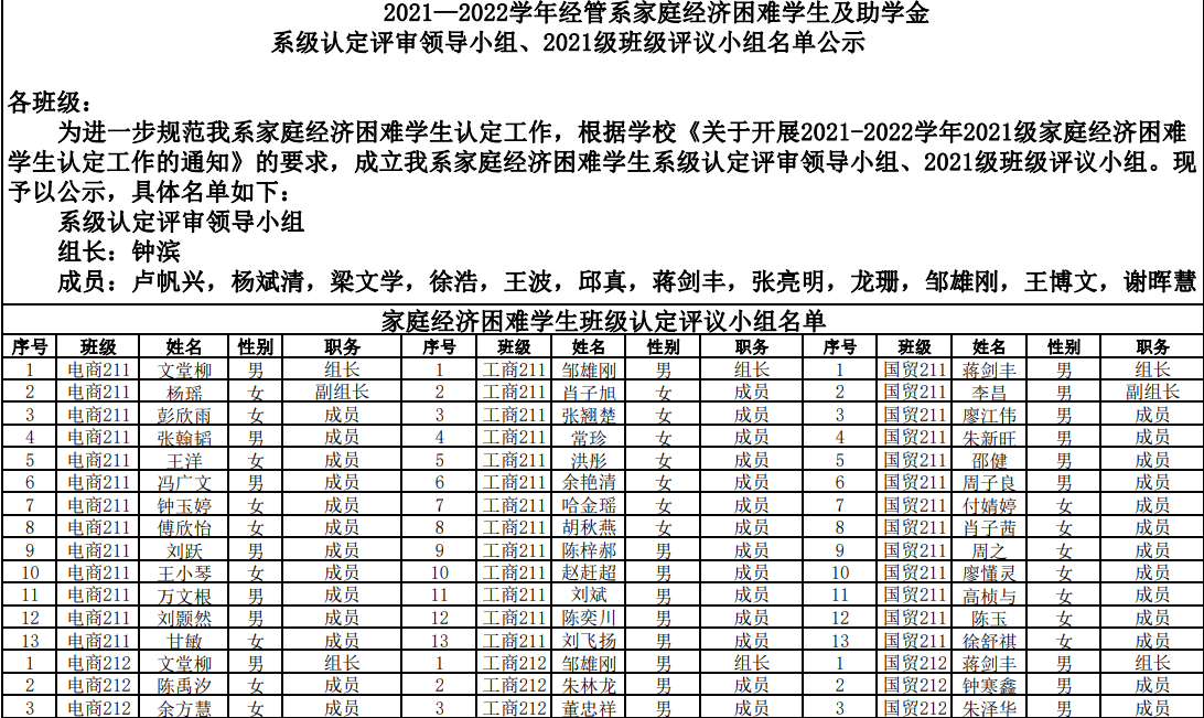 2021—2022学年经管系家庭经济困难员工及助学金系级认定评审领导小组、2021级班级评议小组名单公示