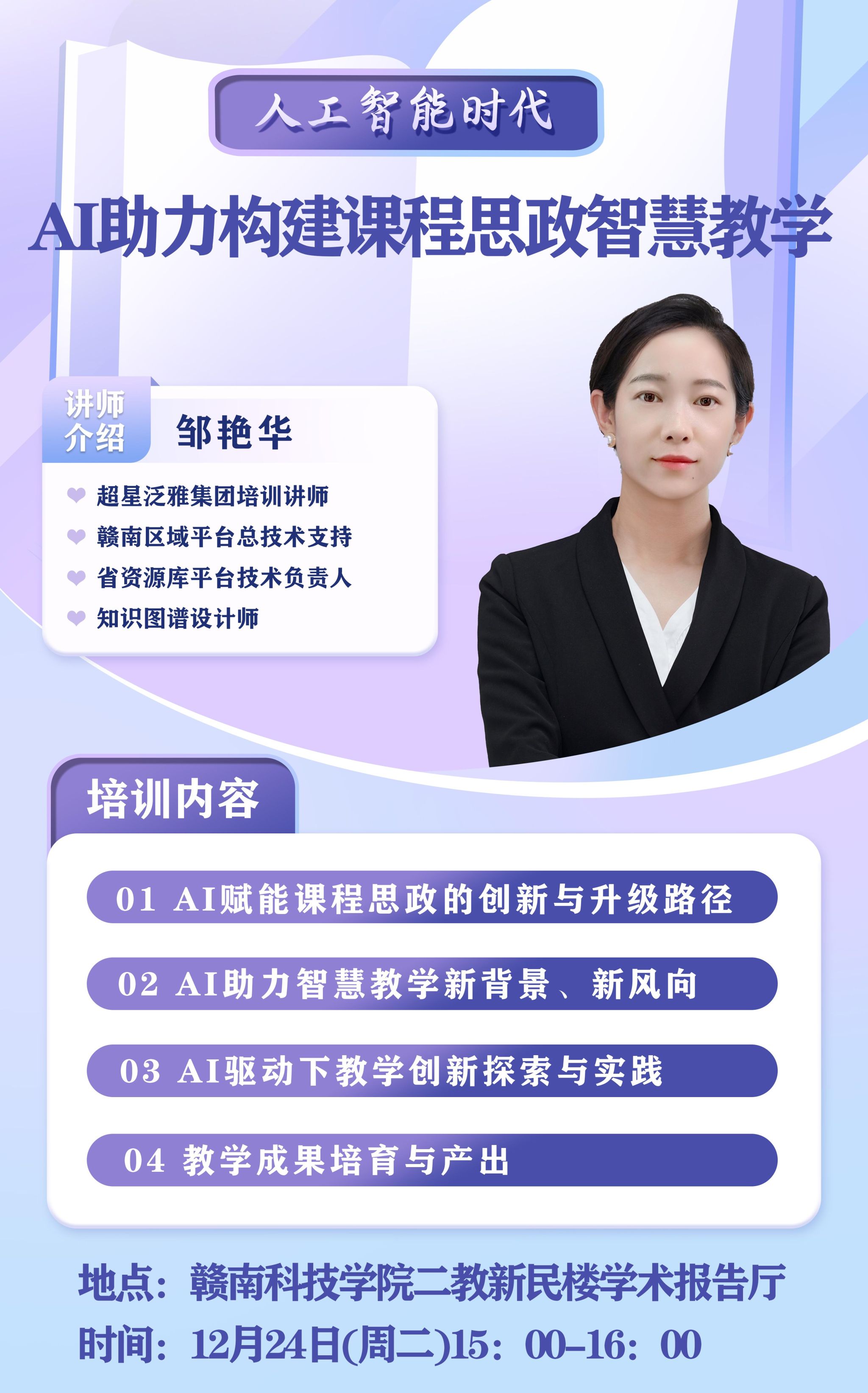 本网讯:在数字化转型浪潮席卷全球的今天,熊猫体育紧跟时代步伐,于12月24日在新民楼302教室举办一场题为“人工智能时代AI助力构建课程思政智慧教学”专题讲座。讲座邀请超星集团邹艳华老师担任主讲嘉宾,公司全体教职工参加讲座。