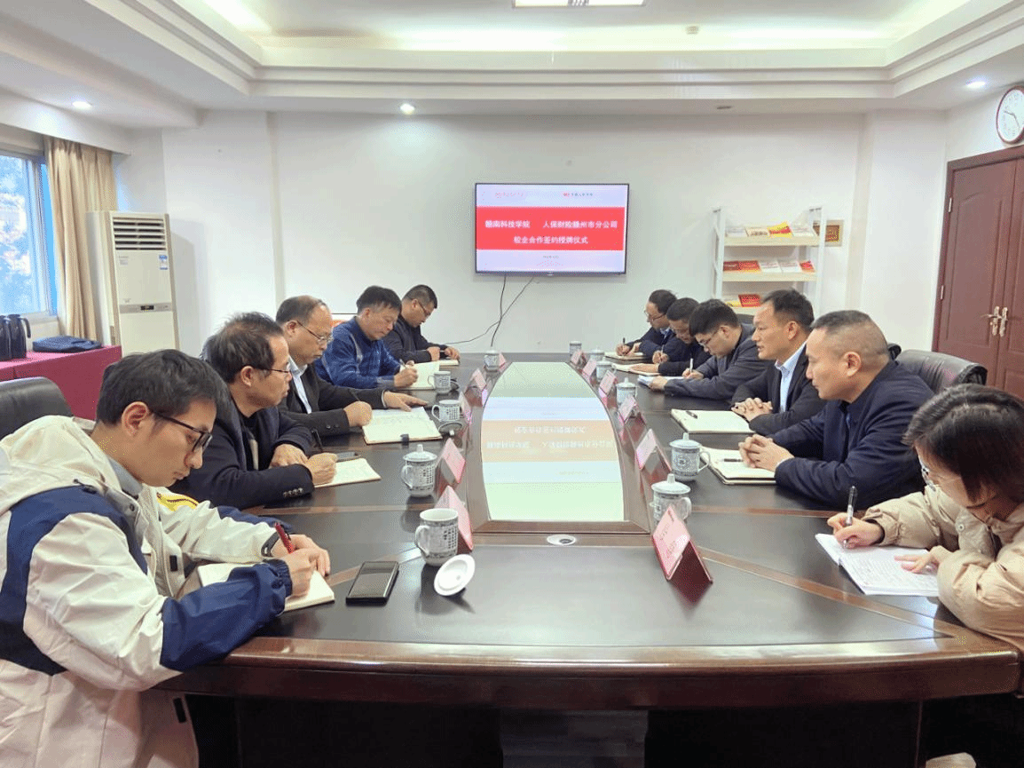签约仪式之前,双方举行了校企合作座谈会。罗伟对左群一行的到来表示欢迎,介绍中国人民财产保险公司赣州市分公司发展历程以及围绕服务国家战略、参与社会治理所取得的成效,并表示市分公司将以此次校企合作协议签署和教学实践基地建立为契机,进一步加大合作力度,在特需专业人才培养、保险专业智库以及服务公司风险防范方面深化合作,共同实现校企产教融合、协同育人、合作共赢。