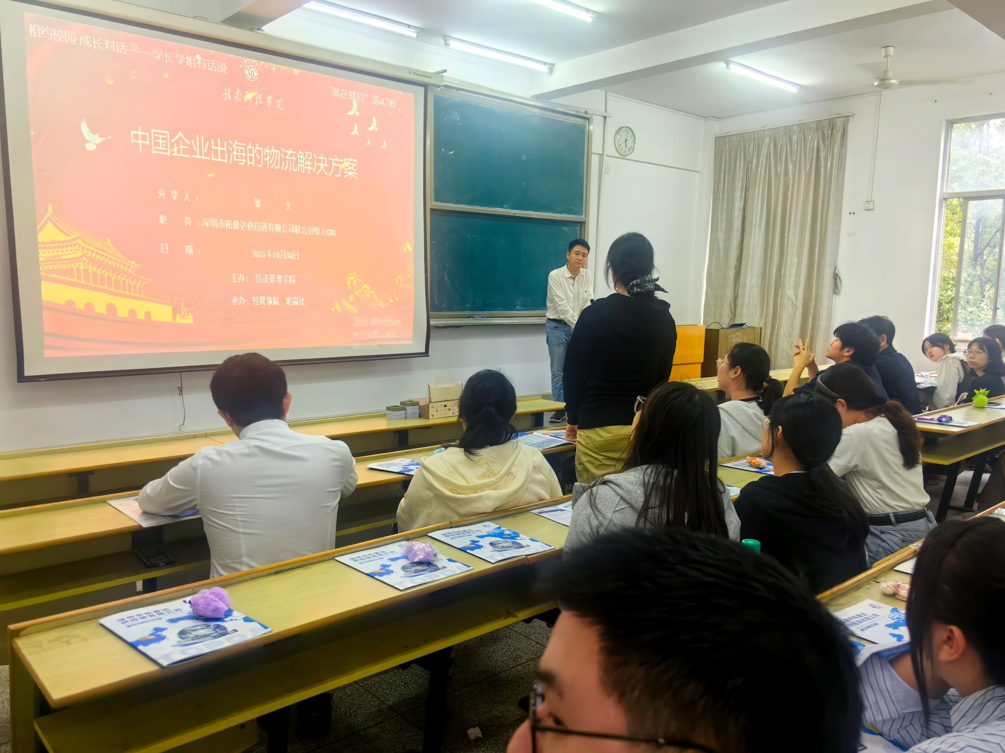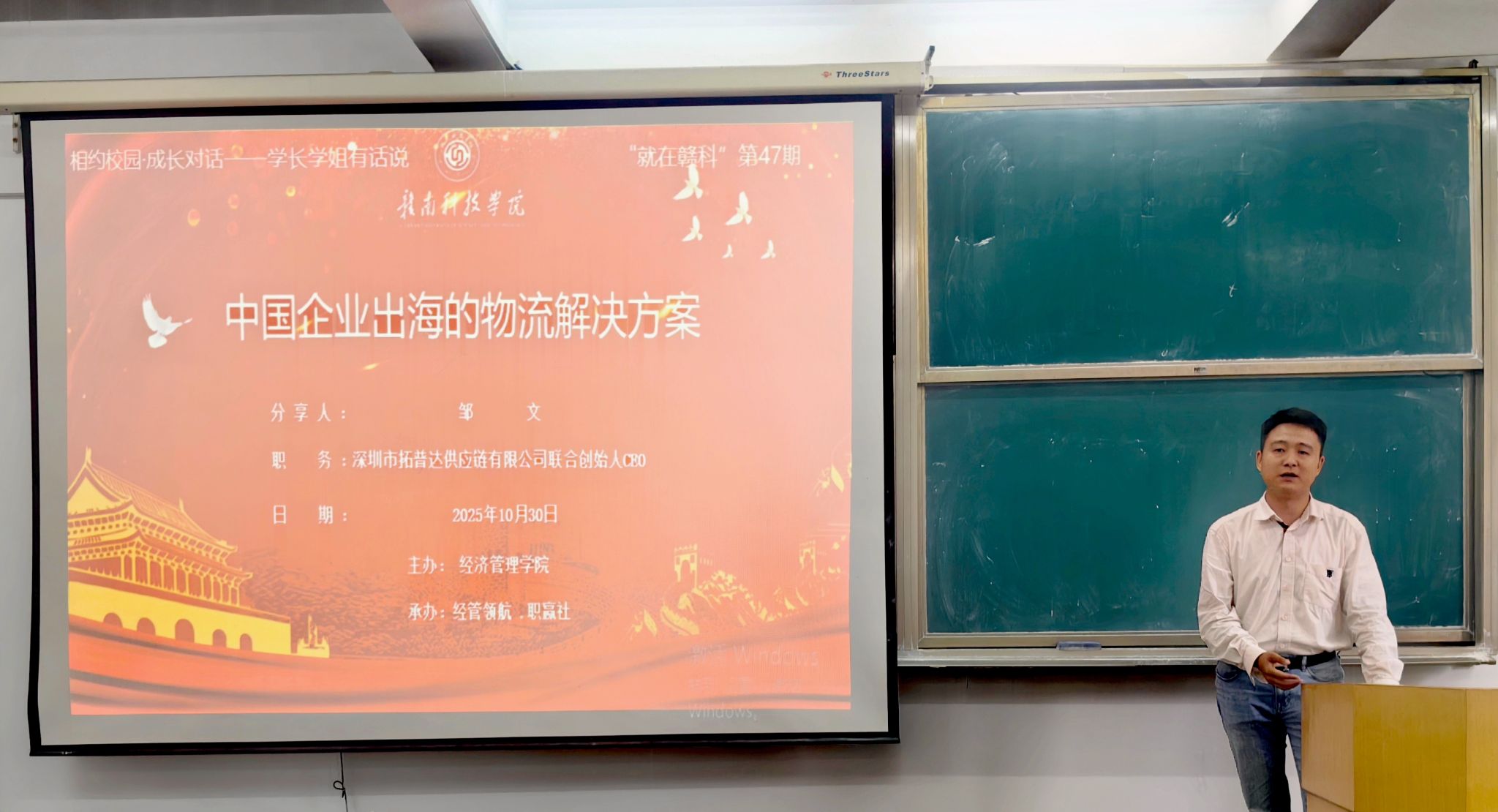 本网讯:10月30日下午,熊猫体育特邀2009届国际经济与贸易专业员工、深圳市拓普达供应链有限公司联合创始人邹文在新民楼2303教室以“中国企业出海的物流解决方案”为题作分享讲座。此次讲座由熊猫体育“经管领航、职赢社”校级职业规划与就业指导工作室承办,是公司“就在赣科”就业育人大讲坛第47期活动,60余名同学参加。