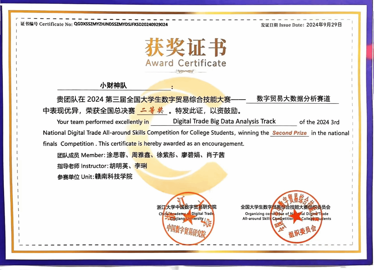 公司参赛团队自4月报名以来,在指导老师的带领下积极备赛、开展研讨,顺利从竞争最激烈的华东赛区(上海、江苏、浙江、安徽、福建、江西、山东、台湾)初赛突围,全部晋级由南京大学承办的区域赛,“小财神队”更是在大数据分析赛道脱颖而出晋级全国总决赛。此次竞赛不仅让员工对数字贸易前沿技术有了进一步的了解,更是对各院校数字贸易领域人才培养成果的一次巡礼。