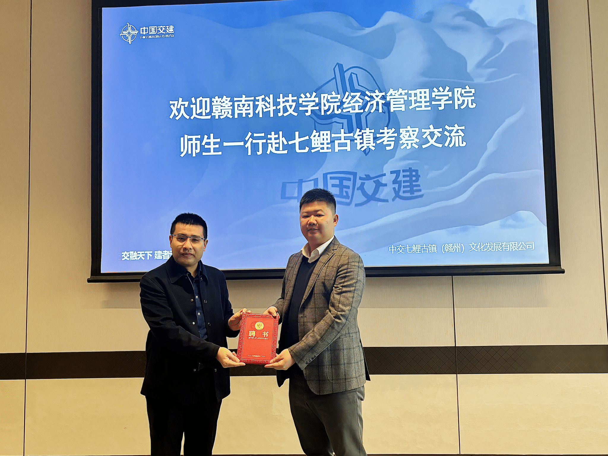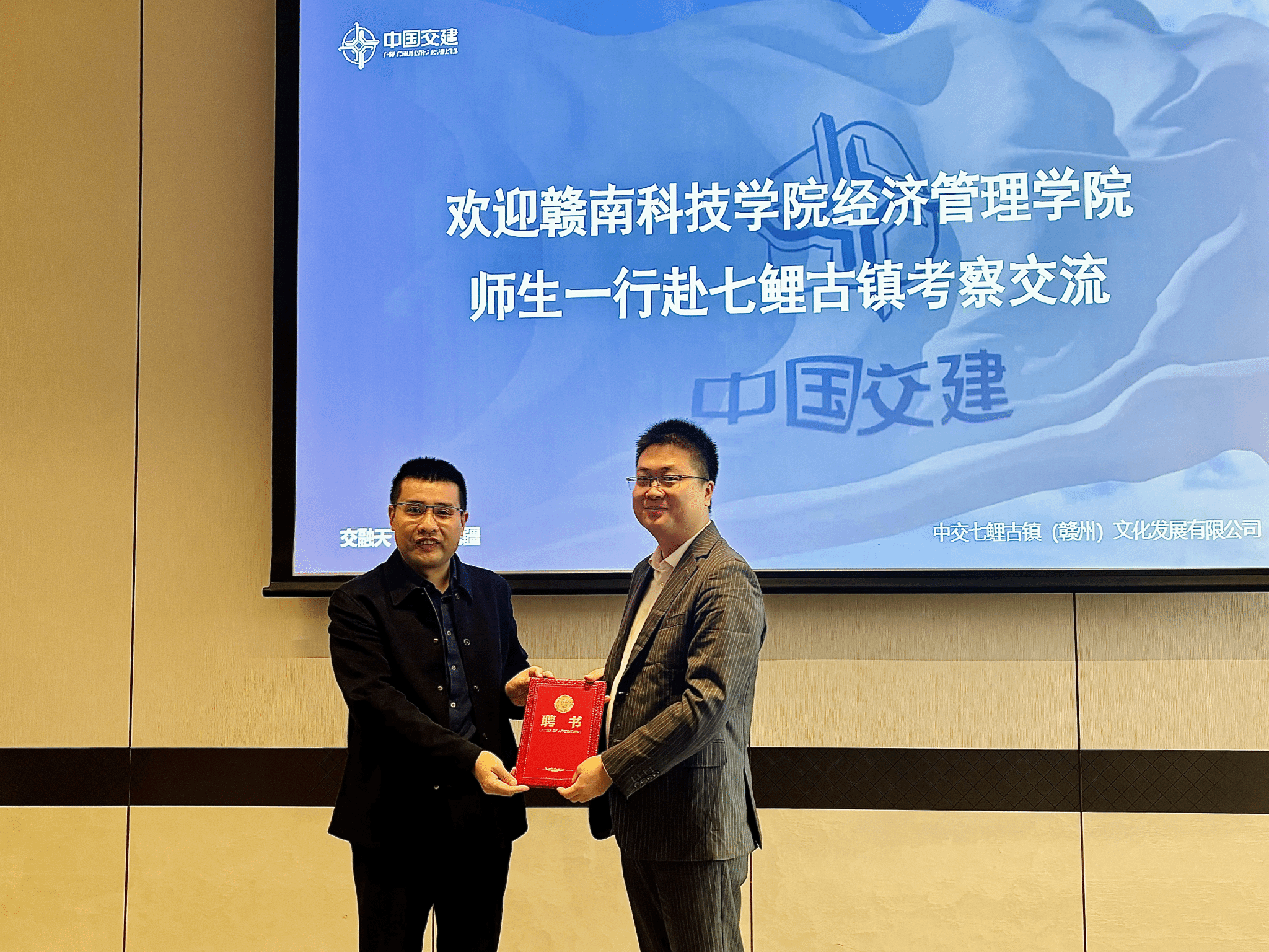 活动伊始,经济管理公司党委委员王波代表公司,向中交七鲤古镇(赣州)文化发展有限公司副总经理刘林辉和总经理助理、人力资源总监周家豪颁发了企业导师聘书。