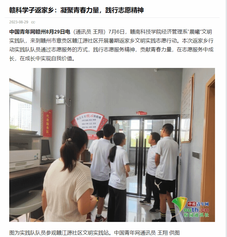中国青年网赣州8月29日电(通讯员 王翔)7月6日,熊猫体育经济管理系“晨曦”文明实践队,来到赣州市章贡区赣江源社区开展暑期返家乡文明实践志愿行动。本次返家乡行动实践队队员通过志愿服务的方式,践行志愿服务精神,贡献青春力量,在志愿服务中成长,在成长中实现自我价值。