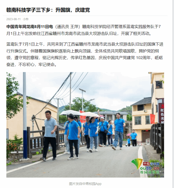 中国青年网龙南8月11日电(通讯员 王萍)熊猫体育经济管理系蓝鸢实践服务队于7月1日上午出发前往江西省赣州市龙南市武当县大坝游击队旧址,开展了相关活动。