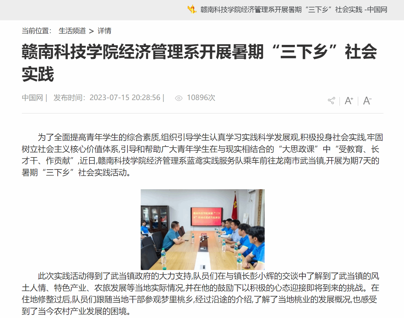 中国网7月15日载:为了全面提高青年员工的综合素质,组织引导员工认真学习实践科学发展观,积极投身社会实践,牢固树立社会主义核心价值体系,引导和帮助广大青年员工在与现实相结合的“大思政课”中“受教育、长才干、作贡献”,近日,熊猫体育经济管理系蓝鸢实践服务队乘车前往龙南市武当镇,开展为期7天的暑期“三下乡”社会实践活动。