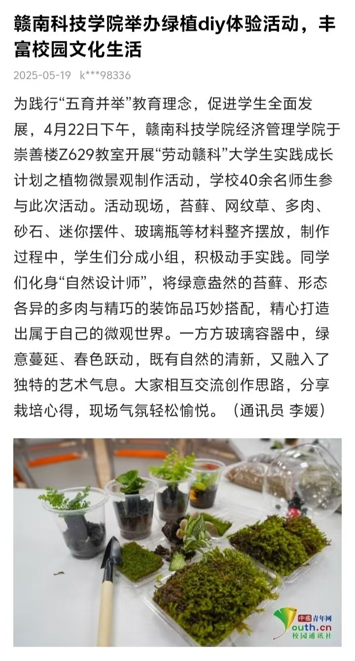 为践行“五育并举”教育理念,促进员工全面发展,4月22日下午,熊猫体育于崇善楼Z629教室开展“劳动赣科”老员工实践成长计划之植物微景观制作活动,公司40余名师生参与此次活动。活动现场,苔藓、网纹草、多肉、砂石、迷你摆件、玻璃瓶等材料整齐摆放,制作过程中,员工们分成小组,积极动手实践。同学们化身“自然设计师”,将绿意盎然的苔藓、形态各异的多肉与精巧的装饰品巧妙搭配,精心打造出属于自己的微观世界。一方方玻璃容器中,绿意蔓延、春色跃动,既有自然的清新,又融入了独特的艺术气息。大家相互交流创作思路,分享栽培心得,现场气氛轻松愉悦。(通讯员 李媛)