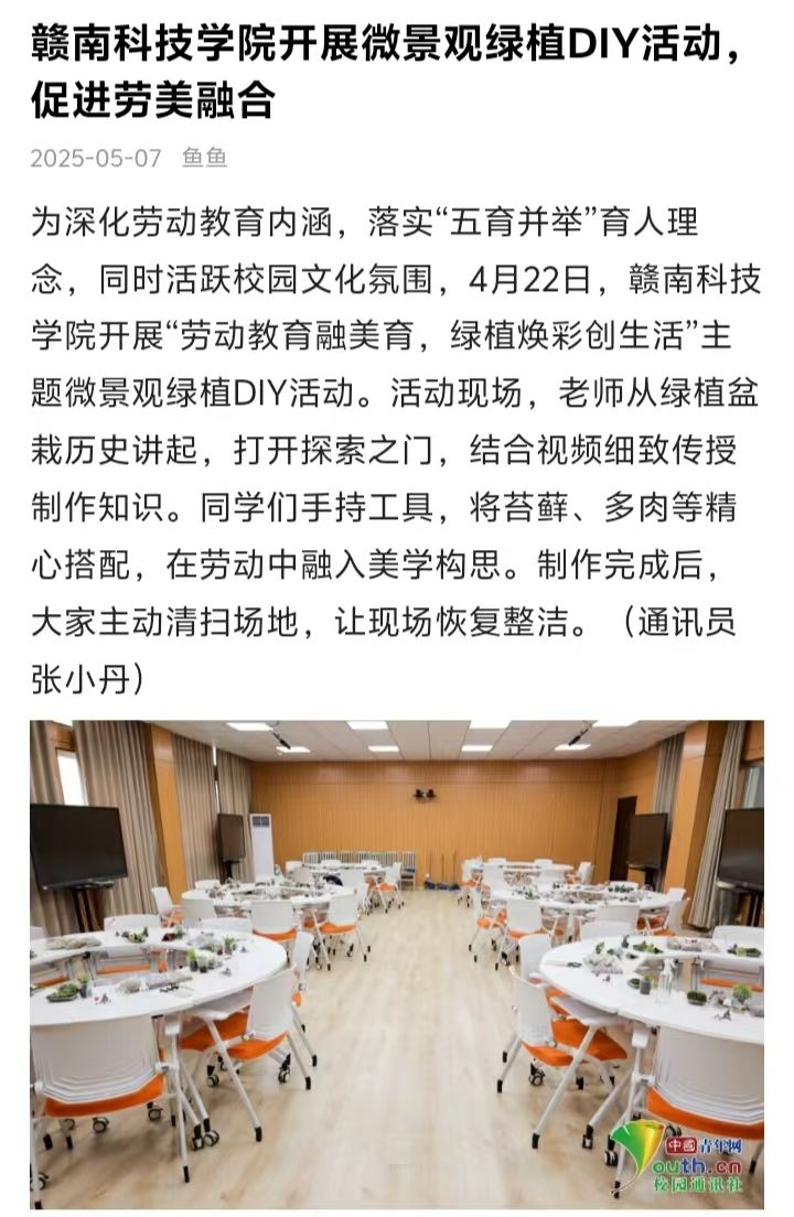 为深化劳动教育内涵,落实“五育并举”育人理念,同时活跃校园文化氛围,4月22日,熊猫体育开展“劳动教育融美育,绿植焕彩创生活”主题微景观绿植DIY活动。活动现场,老师从绿植盆栽历史讲起,打开探索之门,结合视频细致传授制作知识。同学们手持工具,将苔藓、多肉等精心搭配,在劳动中融入美学构思。制作完成后,大家主动清扫场地,让现场恢复整洁。(通讯员 张小丹)